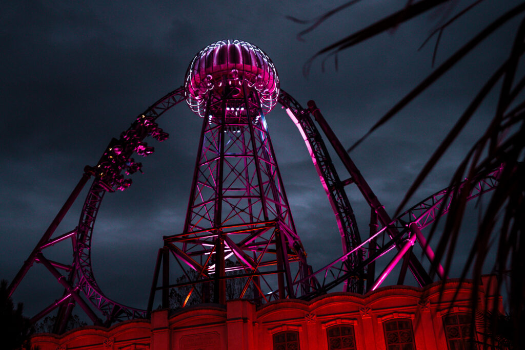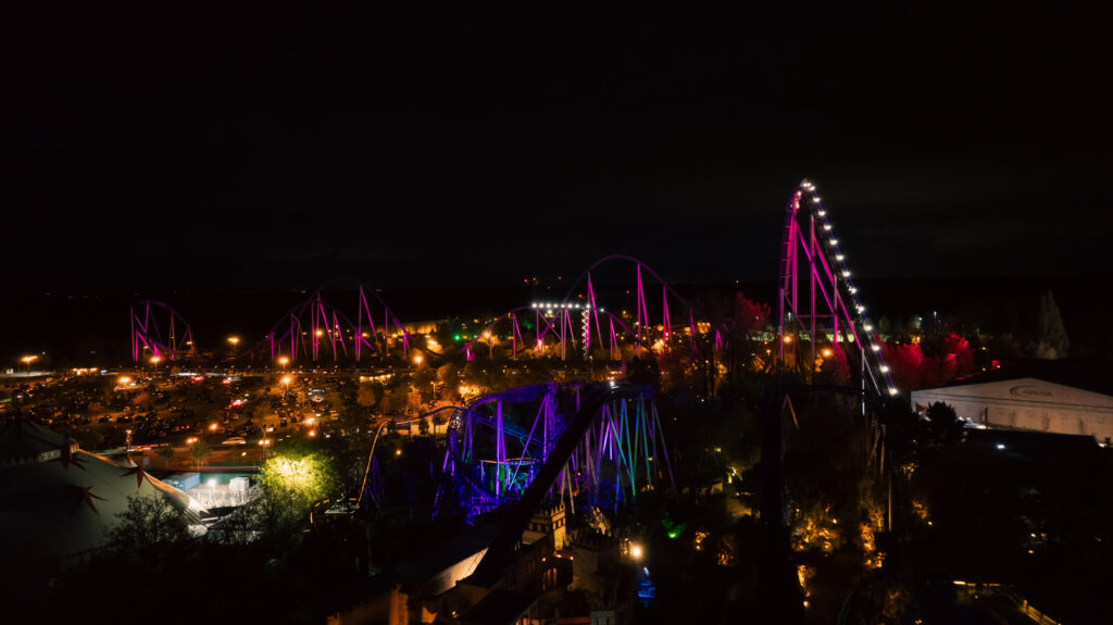 Ob der Multi Launch Coaster „Voltron Nevera powered by Rimac“, der 73 Meter hohe „Silver Star“ oder die glitzernde Kugel des „Eurosat – CanCan Coaster“ – nach Einbruch der Dunkelheit strahlen sie in Rosatönen und machen damit auf das Thema Brustkrebsvorsorge aufmerksam.