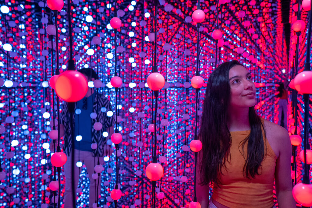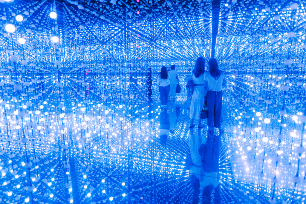 Die Räume verbinden Bilder, Licht und Klang. Dadurch entsteht eine Umgebung, die sich ständig verändert. Viele Besucher nutzen die Ausstellung auch für Fotos.