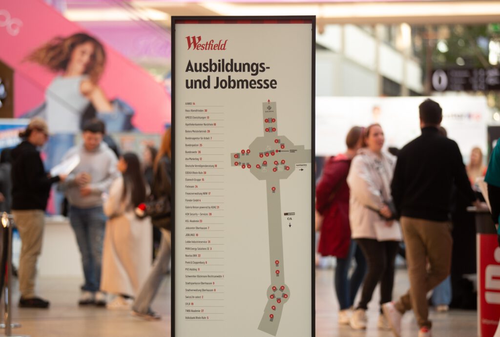 Im Westfield Centro in Oberhausen steht am 19. März eine Job- und Ausbildungsmesse auf dem Programm. Von 10 bis 16 Uhr stellen sich im Erdgeschoss zahlreiche Unternehmen aus der Region vor. Der Besuch ist kostenlos. Eine Anmeldung ist nicht nötig.