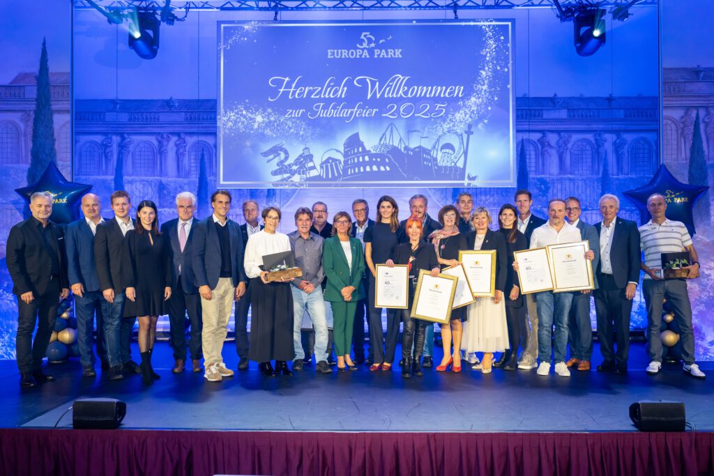 Insgesamt feierten 33 Mitarbeitende ihr 20-jähriges Jubiläum, 28 das 25-jährige, 14 das 30-jährige, 6 das 35-jährige, 4 das 40-jährige – und 2 Mitarbeitende sind bereits seit 45 Jahren Teil des Unternehmens. Erstmals wurden in diesem Jahr auch 9 Mitarbeitende von MACK Rides für ihre langjährige Betriebszugehörigkeit geehrt. Außerdem verabschiedete der Europa-Park 26 Mitarbeitende, darunter vier von MACK Rides, in den wohlverdienten Ruhestand.